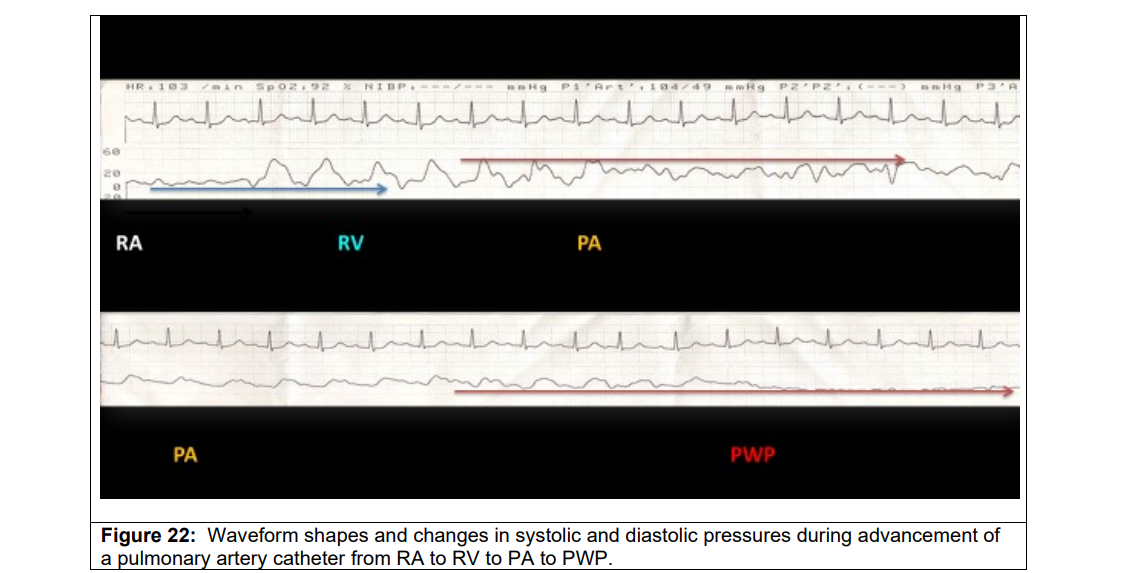 Central vein > SVC, IVC, > RA > tricuspid > RV > RVOT > pulmonary valve > PA (25/10 mmHg) balloon for PCWP or PAOP (4-12 mmHg, determine the cause of pulmonary hypertension, gives indirect assessment of left filling pressure), Sv02 draw ( >70%, determine cause of shock, cardiogenic, septic or distributive) > CO (4-8 L/min),