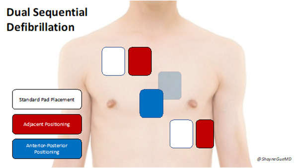 Created by Shayne Gue, MD, MSMEd | Standard Placement: The first set of pads (white) is placed in the anterior-lateral (AL) position, with one pad on the upper right chest and the other on the lower left chest. Second Set Placement (Alternate): The second set can be placed in two ways: Anterior-posterior (AP) placement (blue) involves placing one pad on the sternum and the other on the back, while the second set anterior-lateral (red) involves placing the pads next to the first AL pads, ensuring they do not touch.
